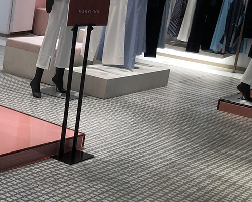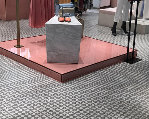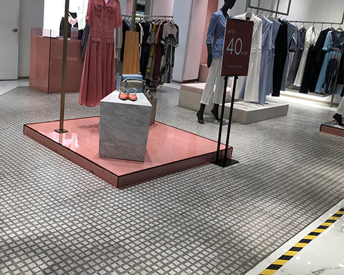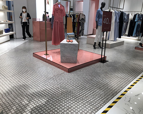 В этом магазине женской модной цепи есть наши плитки с рисунком Lite 600x600 мм на полу. Серый и белый клетчатый дизайн создает плавный, унифицированный вид, обеспечивая чистый фон, который помогает клиентам сосредоточиться на одежде.