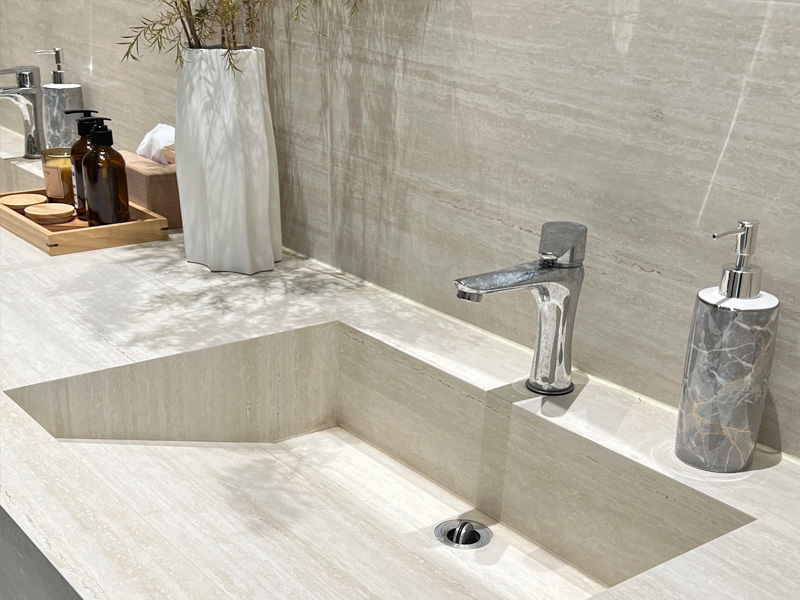 Что отличает этот проект, так это инновационное использование травертиновых плиток 75x150. Мало того, что они украшают стены и полы, но и плавно разрабатывают дизайн раковины с одной кусочкой, без особых усилий смешивая места для ванной комнаты в окружающие стены. Эта интеграция не только добавляет утонченность, но и переопределяет концепцию гармоничного дизайна в вилле.