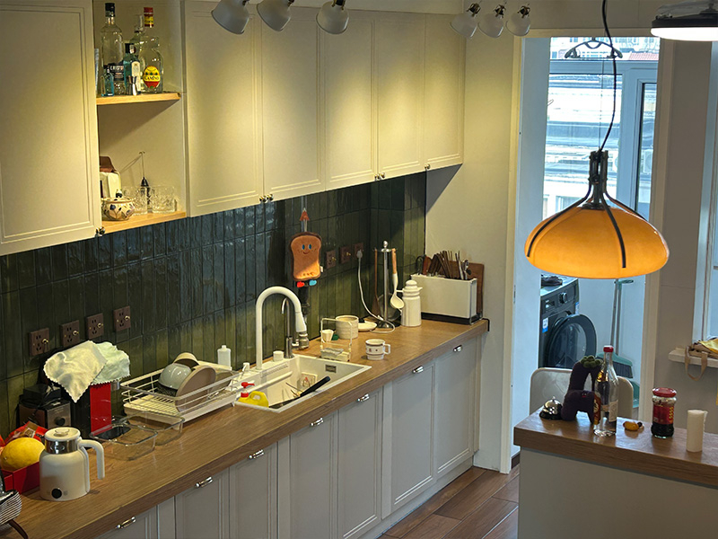 Backsplash имеет плитку TM19, в сочетании с белыми шкафами и зелеными плитками для создания естественной среды. Этот выбор дизайна приносит на кухню прикосновение природы, что делает приготовление расслабляющего и приятного опыта.