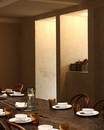 Этот исторический ресторан подвергался потрясающему ремонту, используя тонкие мозаичные плитки, нанесенные непосредственно на существующие стены. Как стены, так и потолок были покрыты одинаковой мозаикой, создавая захватывающую и окутывающуюся атмосферу для посетителей. Дизайн подчеркивает винтажную эстетику, позволяя гостям наслаждаться опытом, пропитанным в истории и элегантности.