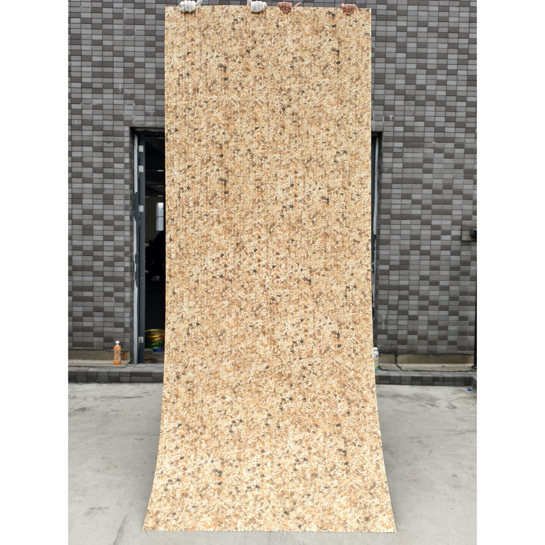 Терраццо на стенах, гибкий камень - это легкое и адаптируемое покрытие стен, которое повторяет вечную красоту терраццо с повышенной гибкостью. Изготовленная из тонкого слоя реального камня, связанного с гибкой поддержкой, он легко соответствует изогнутым и неровным поверхностям. Его крапчатый, разноцветный дизайн добавляет современный и элегантный штрих к интерьерам и экстерьерам, предлагая прочное, низкое обслуживание и стильное решение для облицовки.